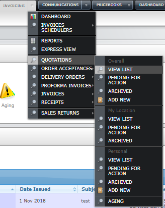 2. Klik pada “INVOICING”, pilih “QUOTATIONS” dan klik “ADD NEW” seperti di (A).