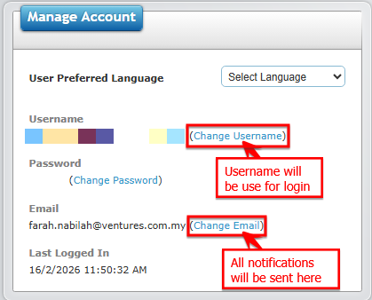 If you experience any issues updating your account information, please contact your system administrator or support team at support@ventures.com.my for assistance.