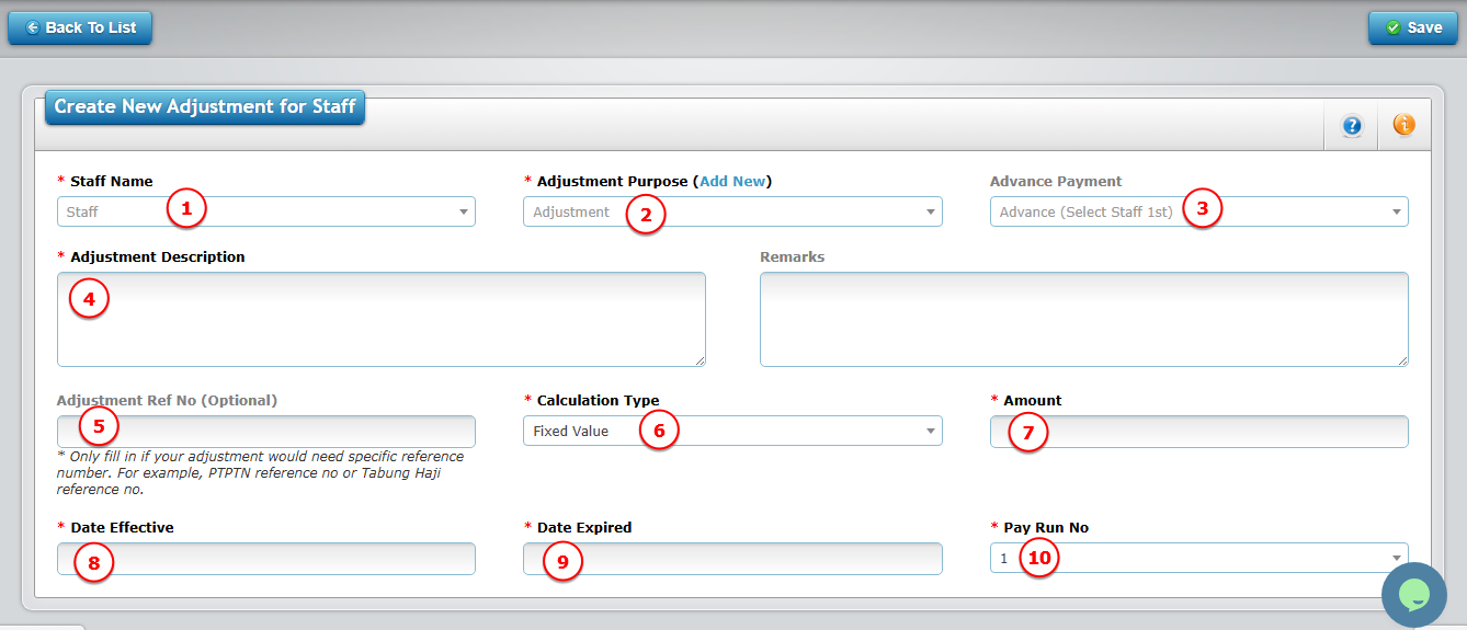 | 10 | Pay Run No. | Select salary payment cycle | Select which payroll cycle this adjustment should be applied to.