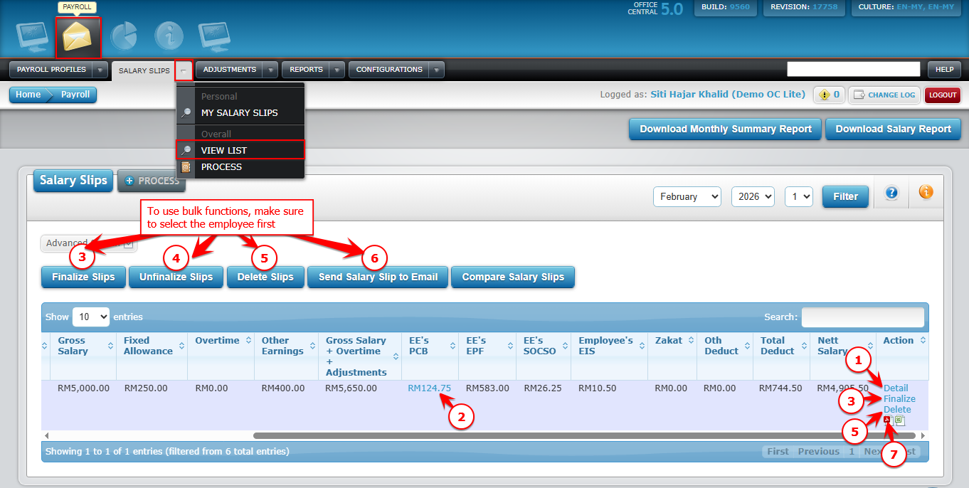 6Send salary slip to emailSend salary slip copy to staff via emailCharges apply to OC Credit. Make sure the account has sufficient OC Credit before sending.
