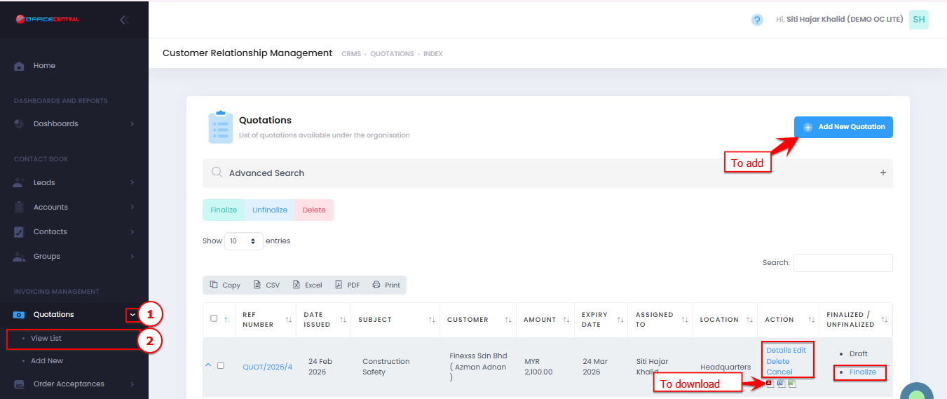 This guide explains how to create, edit, delete, and finalize quotations in CRM.