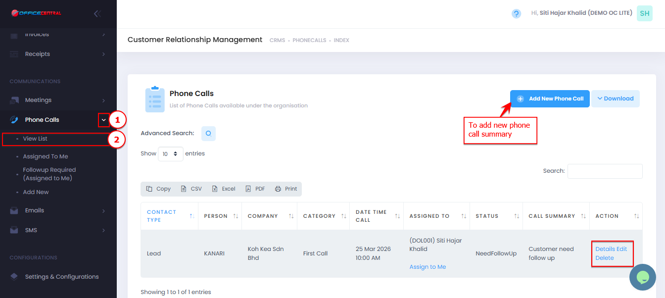 | 2 | Edit | Update phone call details |