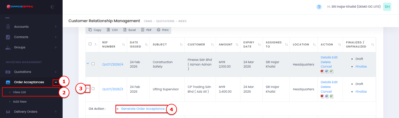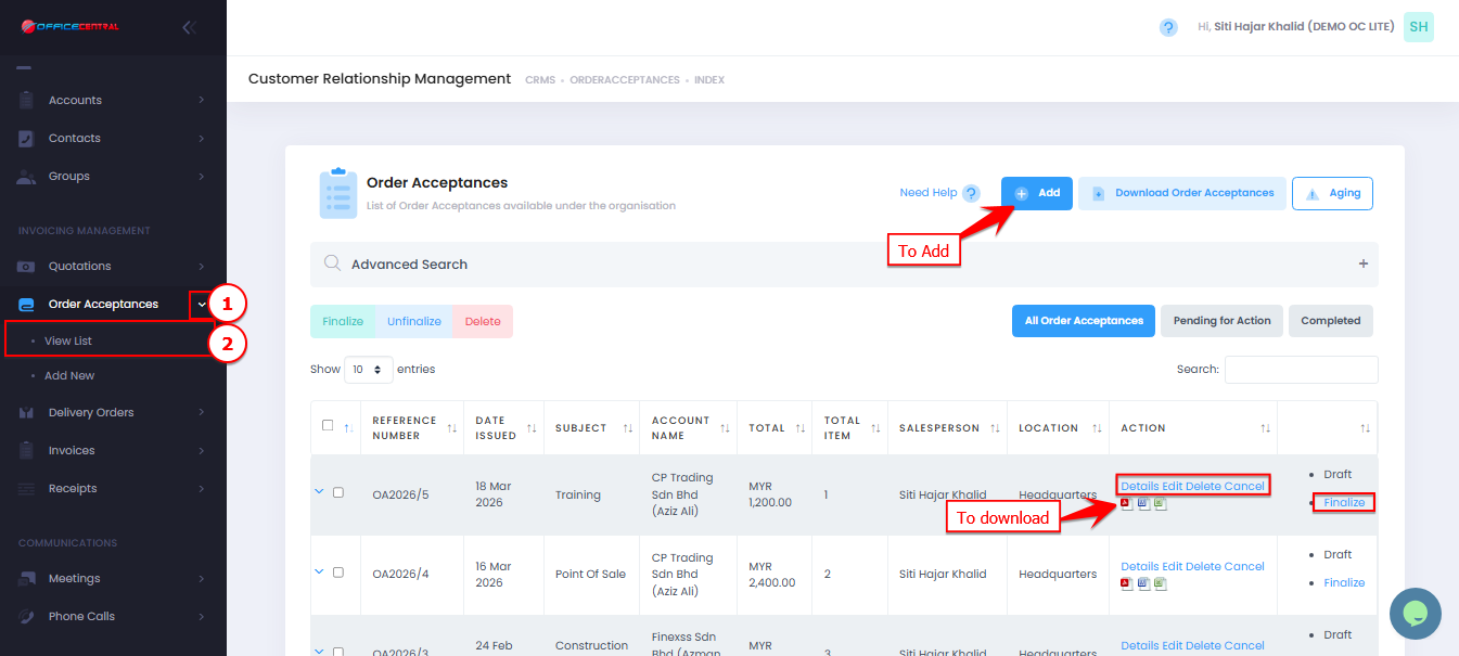 This guide explains how to create, edit, delete, and finalize Order Acceptance in CRM.