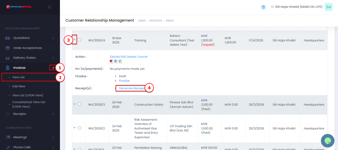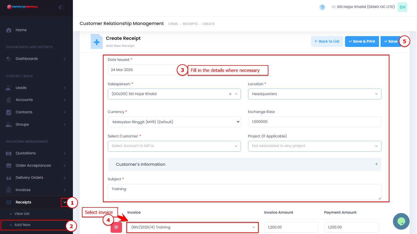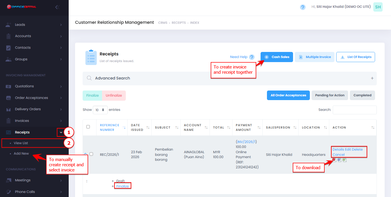 This guide explains how to create, edit, delete, and finalize Receipt in CRM.