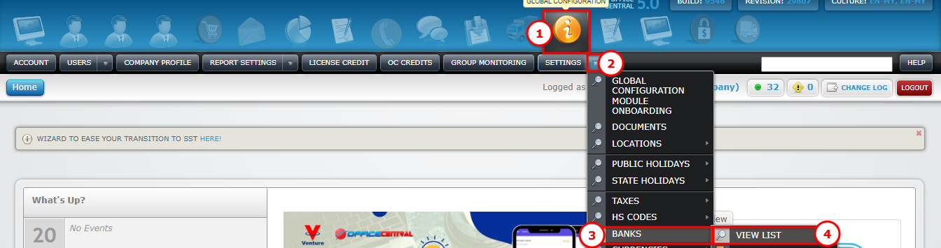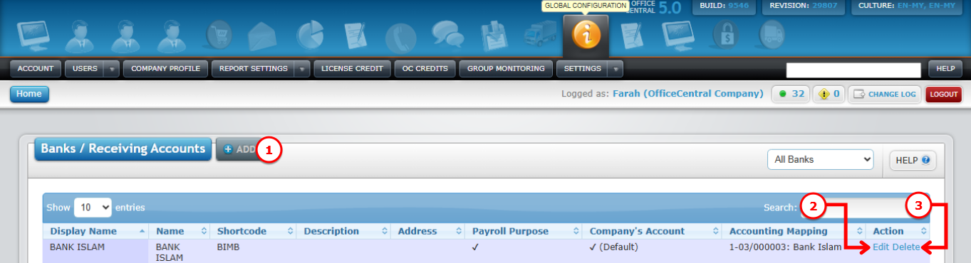 1️⃣ Go to Global Configurations > Settings > Banks > View List