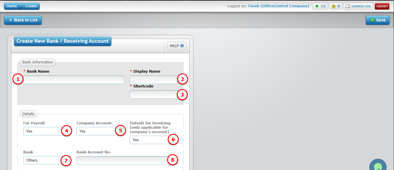 | 5 | Company Account | Select Yes or No | Select Yes if this is the company’s bank account. You must fill in Bank Name and Bank Account Number |