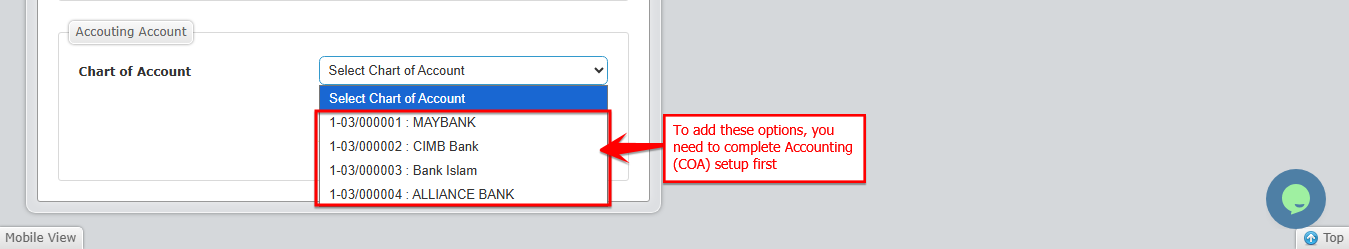 2️⃣ Select the Chart of Account for the bank