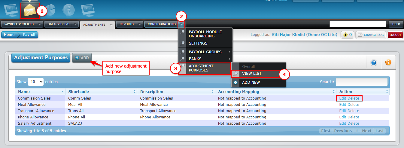 Go to Payroll > Configurations > Adjustment Purposes > View List