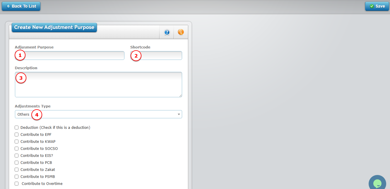 In OfficeCentral, you can also add additional earnings (allowance, bonus, commission, gratia etc) and additional deductions (PTPTN, advances, staff loan etc) types calculated during salary processing. To access this module, you need to have adjustment purpose first.