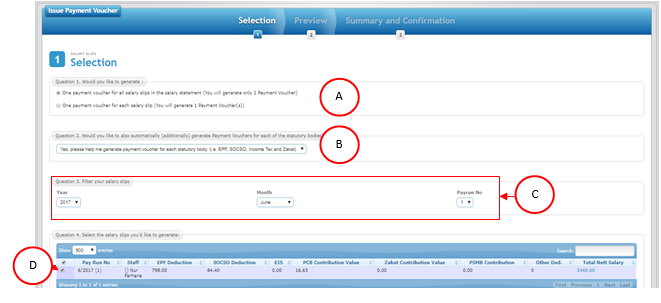 B | Here you can choose whether to generate payment voucher for statutory bodies or not. It have 2 options. |