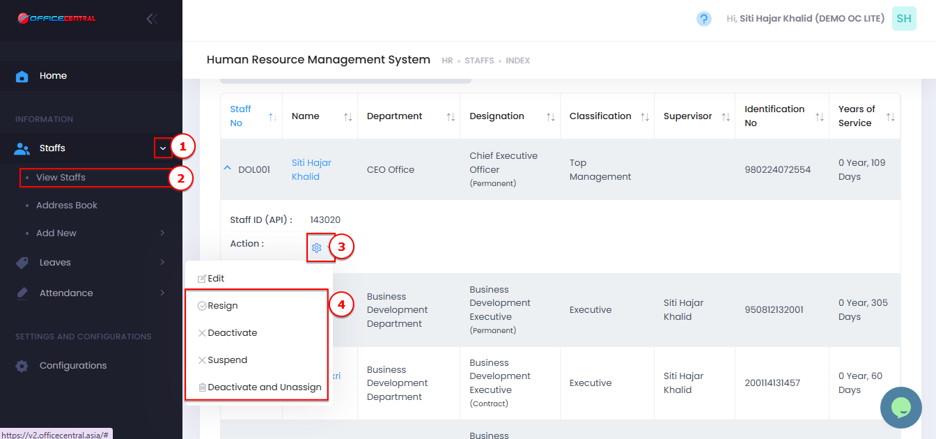 This article explains how to manage staff status in OfficeCentral. It clarifies the difference between Resign, Deactivate, Suspend, and Unassign, and when to use each action.