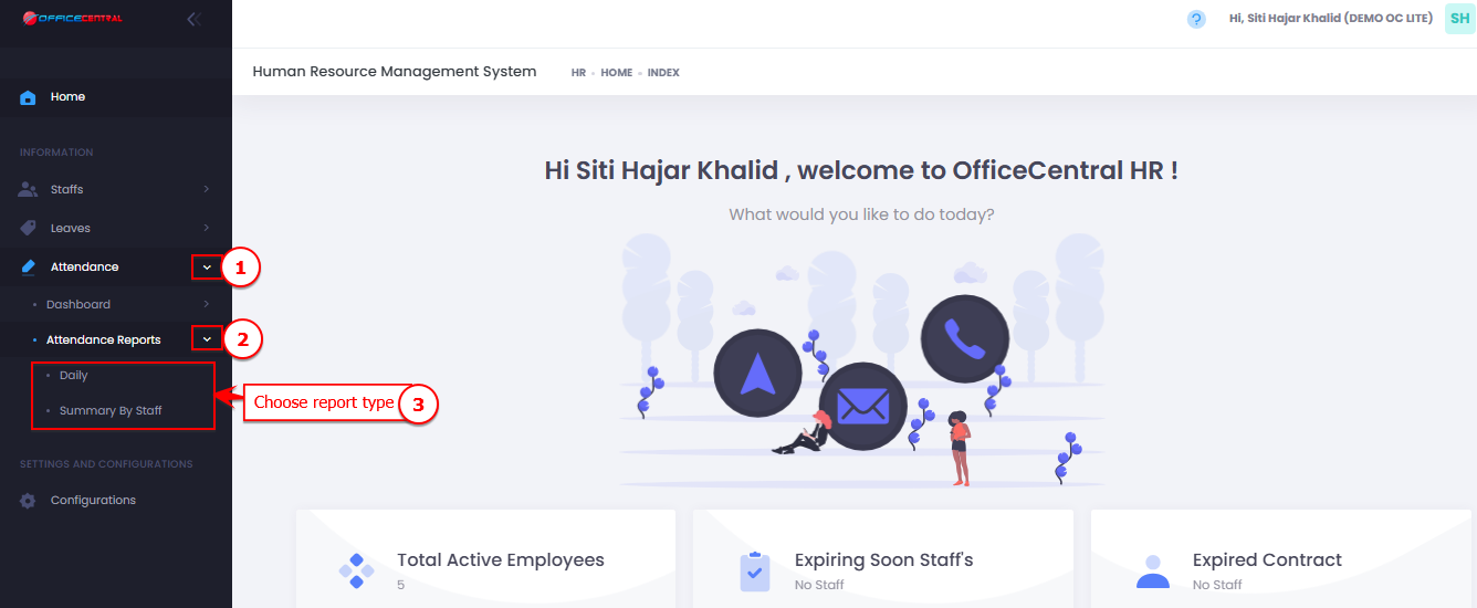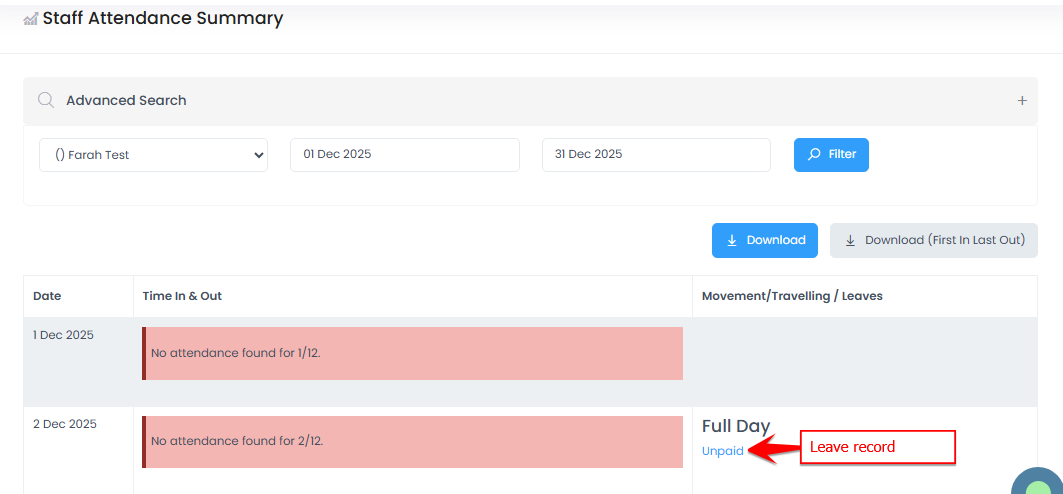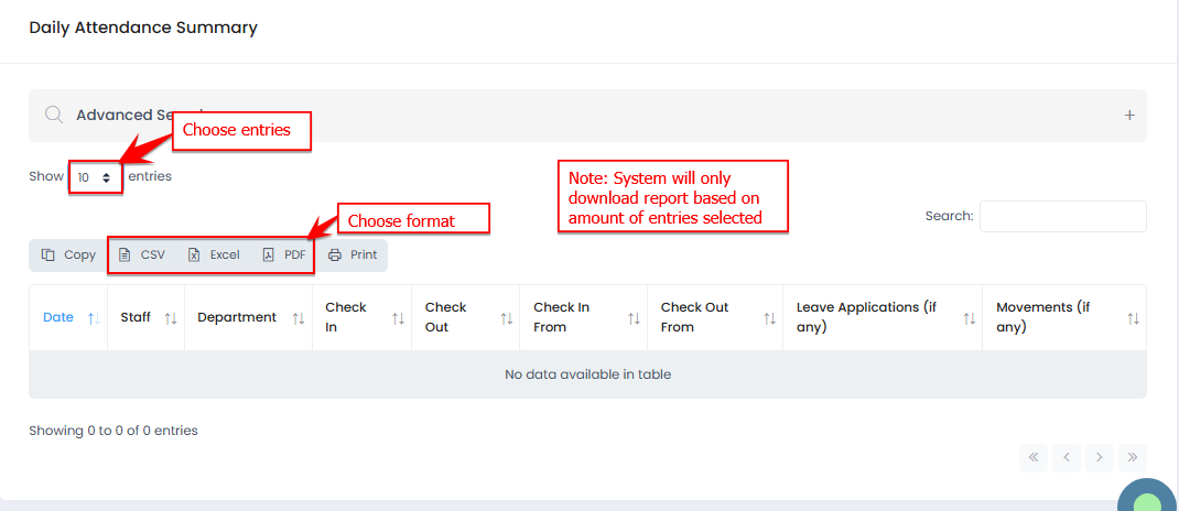 The Daily Attendance Report displays attendance records for all staff based on selected date(s).