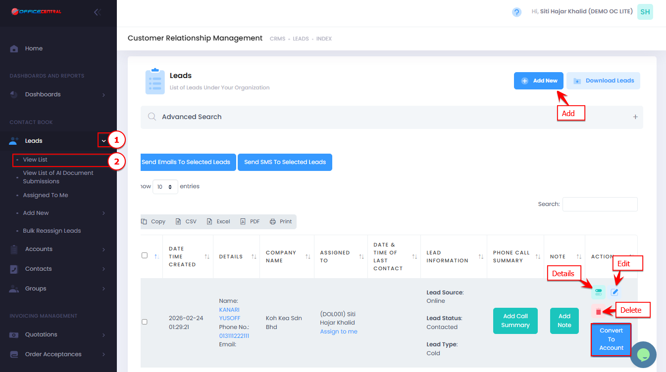 This guide shows how to add, view, edit, and delete leads in OfficeCentral. Leads represent potential customers or prospects who have not yet become full accounts.