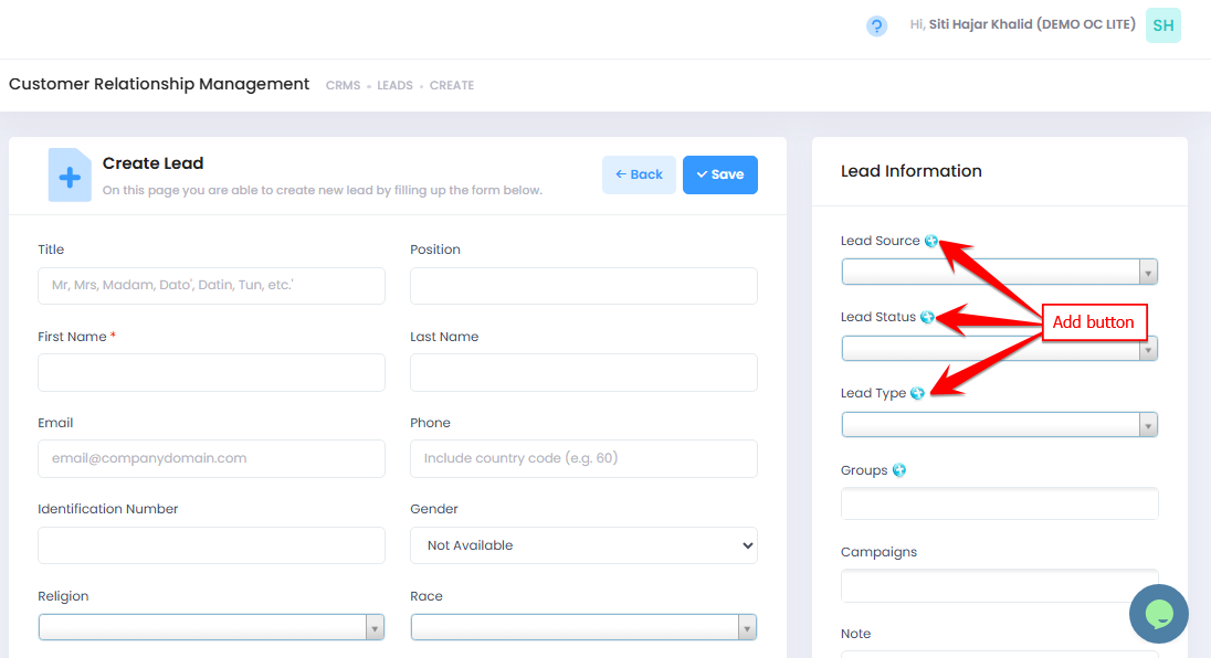 No. Field Description 1 Title Select the appropriate title (e.g., Mr, Mrs, Madam, Dato', Datin, Tun, etc.) 2 Position Job title or role of the lead 3 First Name * Lead’s first name 4 Last Name Lead’s last name 5 Email Enter a valid email address (e.g., email@companydomain.com) 6 Phone Enter phone number with country code (e.g., 60 for Malaysia) 7 Identification Number IC / passport number if applicable 8 Gender Select gender 9 Religion Select religion if applicable 10 Race Select race if applicable