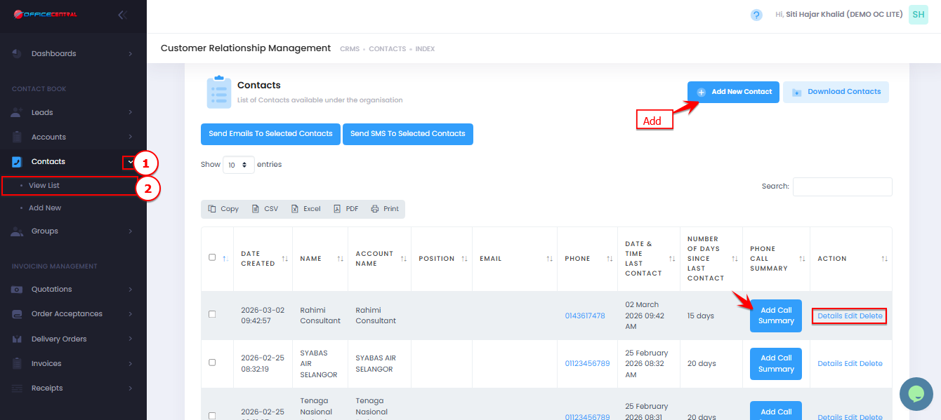 | 1 | Add New Contact | Add a new contact (PIC) under the account |